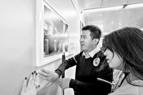 14号线枣营站,视障乘客通过触摸了解艺术作品。