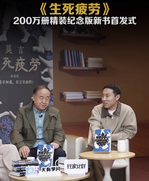 12月23日晚间,莫言携手脱口秀演员徐志胜、主持人@梦章kikaku 现身抖音,完成首场“打破次元壁”的跨界直播对谈。本次直播以《生死疲劳》精装典藏版上线为契机,聚焦文学创作故事、当代年轻人精神现状等议题,用文学与喜剧的碰撞,为近300万网友带来了一场兼具知识厚度与欢乐氛围的思维盛宴。