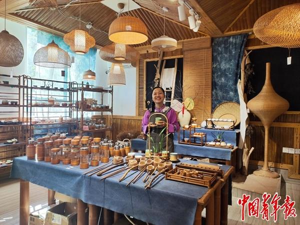 2025年4月18日,贵州省赤水市,牵手竹艺竹编非遗工坊带头人杨昌芹在展示竹编非遗。作为第十三届、十四届全国人大代表,她多次带着赤水竹编去北京。中青报·中青网记者 蒋肖斌/摄