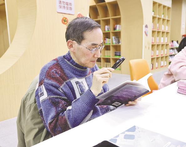 只见老先生戴着眼镜,端坐在桌前,左手持书,右手拿着一把放大镜,在书页上逐行移动,全神贯注。工作人员告诉记者,这位老先生最爱看书,每天必来打卡,一待就是一整天。趁老先生起身给保温杯添水,记者上前和他聊了起来。