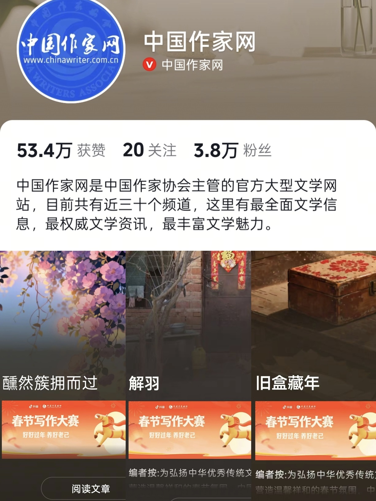 在AI技术不断更新迭代、短视频填满了人们生活空隙的当下,文字书写这种“传统”的表达方式落伍了吗?3月3日,由中国作家协会联合抖音发起,《文艺报》社、《人民文学》杂志社、中国作家网承办的“2026春节写作大赛”落下帷幕。为期不到一个月的征稿时间里,超过2万人选择在中国人最重要的节日——春节登录短视频平台,用800到1500字的长图文,一字一句敲下属于自己和时代的“春节文学”。其中,#用一篇长文记录我的春节话题播放量突破2.5亿次。在2026年的春节,上抖音参与征文大赛,成为今年春节期间新的“文化过大年”方式。
